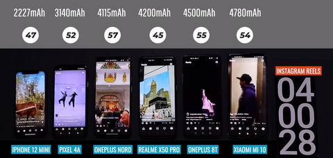 然后三部手机又刷了1个小时的Instagram短视频,在这之后,iPhone 12 mini,谷歌Pixel 4A,一加Nord N10,真我X50 Pro,一加8T和小米10的电量分别掉到了47%、52%、57%、45%、55%、54%。