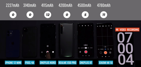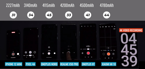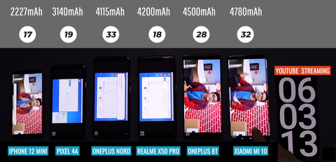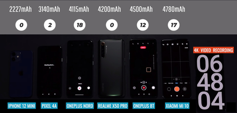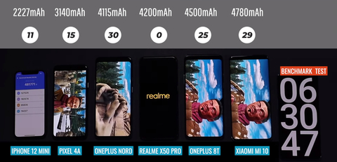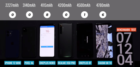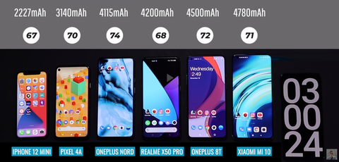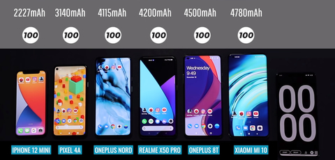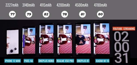 外媒选出了6款配置主流的手机,分别是iPhone 12 mini,谷歌Pixel 4A,一加Nord N10,真我X50 Pro,一加8T和小米10,电池容量分别为2227毫安,3140毫安,4115毫安,4200毫安,4500毫安和4780毫安。第一眼看,小米10的电池容量最大,续航似乎会是最强的,iPhone 12 mini的电池容量最小,续航最差,但真的是这样吗?