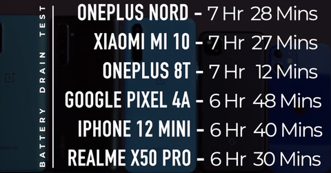 最后测试结果,续航最长的是一加Nord N10,7小时28分钟;第二是小米10,7小时27分钟;第三是一加8T,7小时12分钟;第四是谷歌Pixel 4A,6小时48分钟;第五是iPhone 12 mini,6小时40分钟;而续航最差的是真我X50 Pro,6小时30分钟。