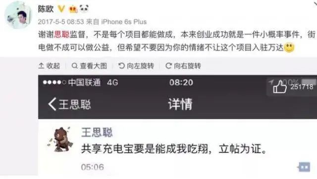 当时,看衰共享充电宝项目的声音也此起彼伏。2017年5月4日,陈欧宣布“街电”获得聚美优品3个亿的融资后,王思聪在朋友圈讽刺称,“共享充电宝要是能成我吃X,立帖为证。”