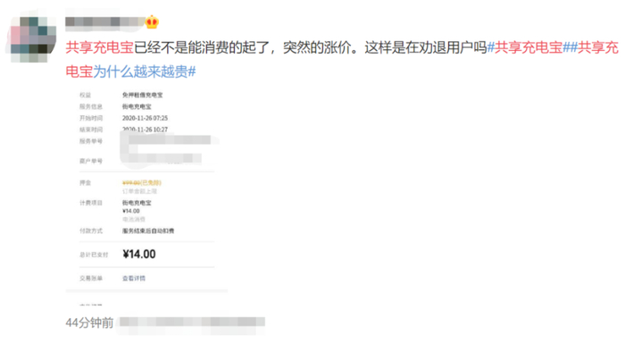11月26日,“共享充电宝为什么越来越贵”登上微博热搜,并遭到网友吐槽。