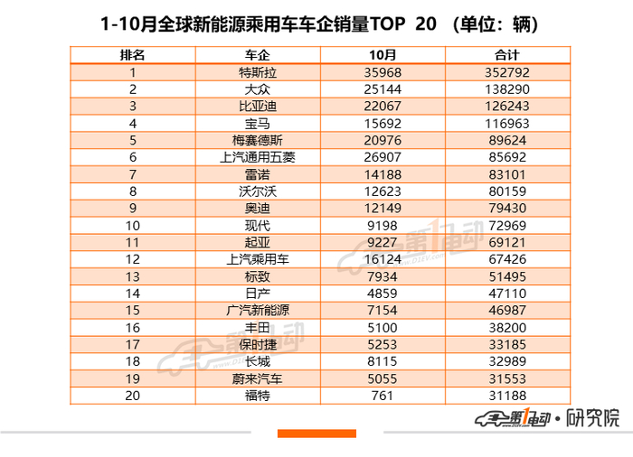 10月,又有一家中国本土企业进入榜单。随着欧拉黑猫的上量,长城目前凭借3.3万辆的累计销量排名第18位。奇瑞的上升势头也非常快,目前累计排名在22位,11月很有希望进入TOP20。