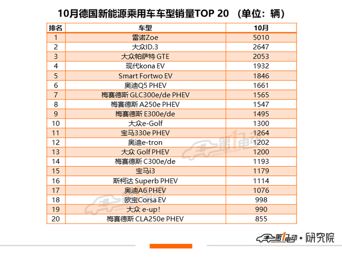 除了TOP20车型以外,沃尔沃XC40 PHEV(620辆)、Mini Cooper(710辆)、奔驰GLE350de (655辆)也在逐渐上量,大众ID.4 也在10月的德国市场交付了72辆。