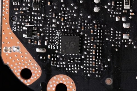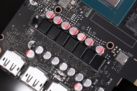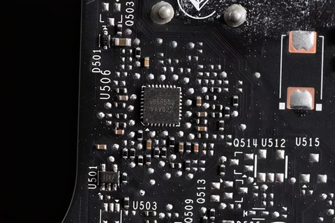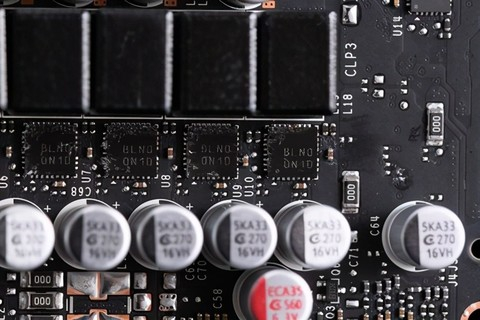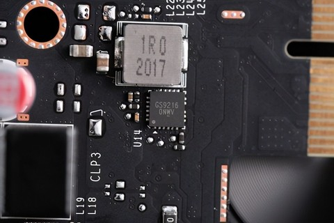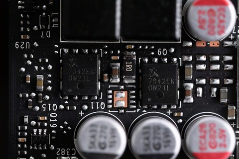供电方面一共是10相供电,其中核心左侧的7相和左上方的1相是给核心供电的,而核心右边的那两相是给显存供电的。PWM主控是uP9512R,8相核心供电的MosFET均是来自万国半导体(Alpha & Omega Semiconductor)的,不过上面只刻了生产批次编号,2相显存供电的MosFET均是来大中(sinopower)的7342EK-OW21L。