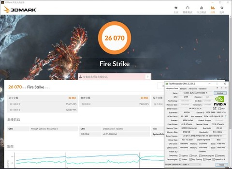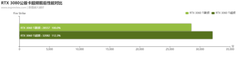将功耗上限和温度上限解锁到最高之后,经过多番手动超频尝试, 这款RTX 3060 Ti公版最终在核心频率+120MHz,GDDR6显存数据速率+3Gbps下完成超频。这个状态下,这张RTX 3060 Ti公版卡能顺利通过3DMark的Fire Strike项目测试并且分数最高, 此时这张RTX 3060 Ti公版卡的Boost频率为1785MHz,显存等效频率为17Gbps。这张RTX 3060 Ti公版卡在超频状态下运行3DMark Fire Strike项目的显卡得分与默频状态下显卡得分的对比如下表所示。