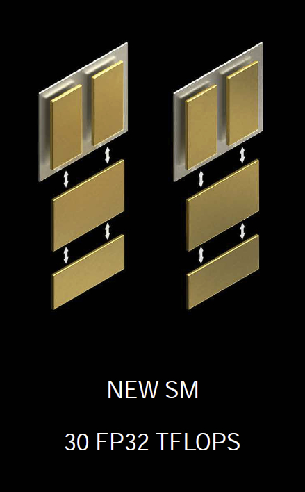 RTX 30系显卡上的SM单元相比RTX 20系的,最大变化是加倍了针对传统计算的FP32单元、引入第二代RT Core以及第三代Tensor Core。
