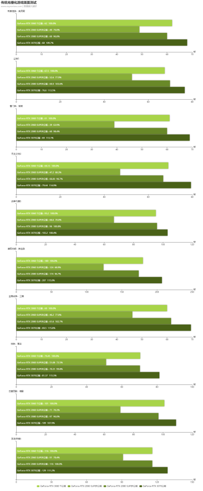而从性能差距来看,就这十款游戏的表现来说RTX 3060 Ti平均领先RTX 2060 SUPER高达38%,而领先RTX 2080 SUPER的幅度为1%,弱于RTX 3070的幅度仅为11%。