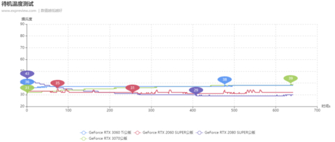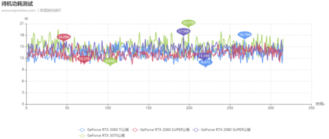 待机功耗方面,GeForce RTX 3060 Ti、GeForce RTX 2060 SUPER、GeForce RTX 2080 SUPER、GeForce RTX 3070的待机功耗均值依次为13.4W、13.1W、14.2W、14.9W。