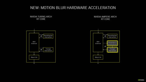 负责进行实时光线追踪运算的专用硬件单元RT Core在NVIDIA Ampere 架构上也更新到了第二代,最主要是增加了动态模糊的加速运算支持。NVIDIA在其中新加入的插值算法可以在保证动态模糊精确性的同时提高了实时光线追踪效率,官方表示最高可达8倍于上代的速度。另外在基础的BVH计算上,第二代RT Core也可以比第一代快2倍。