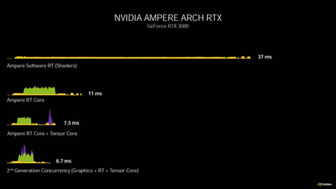 将不同类型的计算交给不同的单元去处理是从NVIDIA Volta架构就开始采纳的一种理念,当时引入的Tensor Core分流了很多AI相关的运算,而在其后引入的RT Core又将实时光线追踪相关的计算给分流了。但在Turing架构GPU上做不到全部运算都能够并行执行,到了Ampere架构上,NVIDIA提升了GPU内部各种单元之间的并行性,现在传统计算单元、RT Core和Tensor Core这三大单元可以同时工作,在原本基础上继续缩短帧渲染时间。