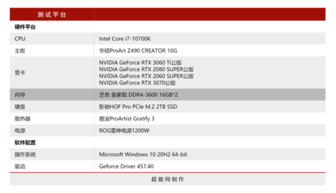 考虑到还是有很多玩家用的是英特尔平台,还不支持PCIE 4.0,并且到了RTX 3060 Ti这种甜点级别来说,我们更考虑实际玩家的处理器情况,最近所以本次测试没有无脑上最强的CPU,而是选用了Intel Core i7-10700K这款价格和性能都较为适合搭配RTX 3060 Ti显卡的处理器,主板采用的是华硕ProArt Z490 CREATOR 10G主板,内存用两根芝奇 皇家戟 DDR4-3600 16GB组成双通道,其他部分如下,不再赘述。