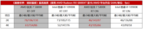 由于我们选择的AMD Radeon RX 6800XT显卡已经属于次旗舰级别,相信入手这款显卡的玩家也不会仅仅满足于在1080P分辨率下玩游戏,因此我们放弃了1080P分辨率的测试,只关注2K与4K分辨率下,AMD锐龙7 5800X与Intel酷睿i9 10900K的游戏体验差异。此外,由于3A平台支持显存智取技术,这也是锐龙5000处理器免费赠送的性能福利,所以我们在测试中会打开此项功能。测试方法方面,我们还是采用了在《魔兽世界:暗影国度》新地图上使用Timetest命令进行Benchmark,并分别在开启光追和关闭光追的条件下进行了测试。