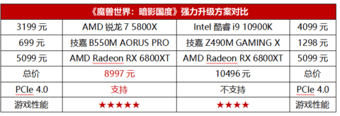 从前面的测试可以看到,AMD锐龙7 5800X凭借先进的7nm工艺、效率大幅提升、延迟大幅降低的ZEN3架构,在《魔兽世界:暗影国度》中完胜Intel酷睿i9 10900K,优势都在13%以上,可以说是高出了一个档次,因此单从性能来说,玩魔兽就应该优先选择AMD锐龙7 5800X。再来看平台价格,AMD锐龙7 5800X满载功耗仅为142W,因此只要供电设计过关的一线品牌B550主板就可以轻松搞定(超频也毫无难度,全核4.8 GHz是常规操作),同时配合PCIe 4.0接口的AMD Radeon RX 6000显卡还能支持显存智取技术,发挥3A套装优势。这样算下来,仅是板U套装部分,AMD锐龙7 5800X的方案相比Intel酷睿i9 10900X的方案就有高达1499元的价格优势!这1499元完全可以再买一块PCIe 4.0固态硬盘,享受极致的游戏载入速度,这对于经常下副本的魔兽玩家来讲非常实用,而且目前也是AMD平台的专属优势,毕竟Intel平台还要等到下一代产品才能支持PCIe 4.0。