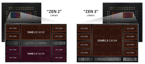 ZEN3采用单CCX 8核心/共享32 MB三级缓存的设计,相比ZEN2数据延迟更低,对提升游戏性能帮助巨大