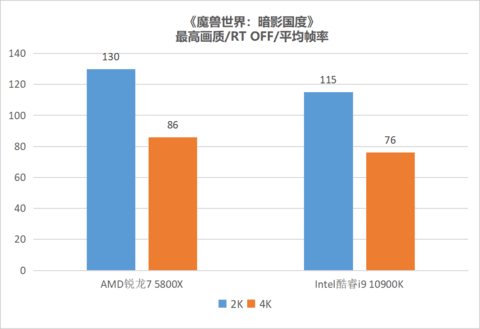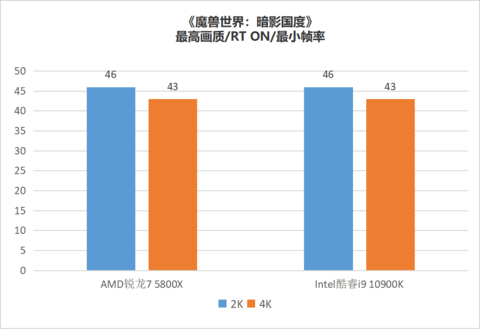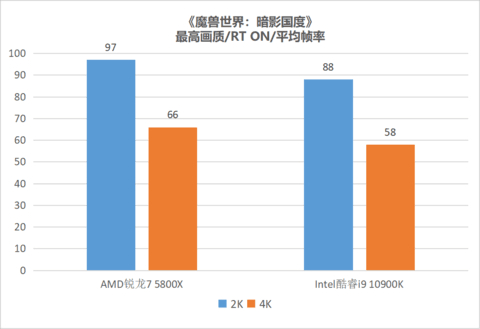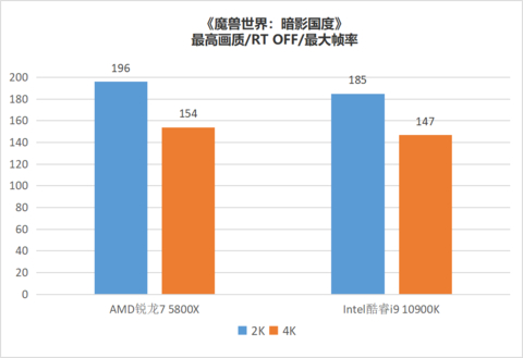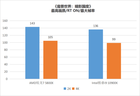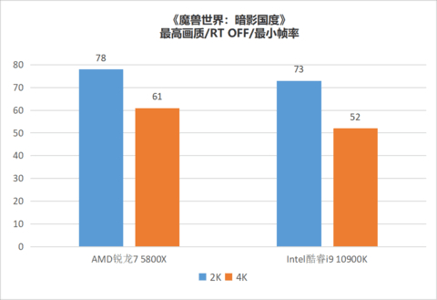 从实测来看,AMD锐龙7 5800X平台的优势可以说是非常明显,在2K分辨率下,平均帧率的领先幅度达13%之多,即便是开启光追,平均帧率优势也达到了10%之多。而在4K分辨率下,AMD锐龙7 5800X的平均帧率领先幅度也达到了13%,开启光追后优势更是接近14%。特别是在4K分辨率开启光追的情况下,AMD锐龙7 5800X依然还能保持平均60fps以上的流畅帧率,而Intel酷睿i9 10900K的平均帧率已经掉到60fps标准线以下去了。此外,在最大帧方面,AMD锐龙7 5800X的领先幅度也很明显,最小帧方面,关闭光追的情况下AMD锐龙7 5800X也大幅领先,而开启光追后基本战平。总的来说,在《魔兽世界:暗影国度》中,AMD锐龙7 5800X的帧率表现是完胜Intel酷睿i9 10900K的,而且在价格方面也更有优势,确实值得魔兽玩家优先选择。