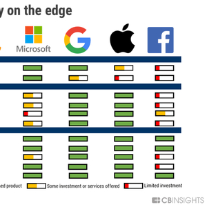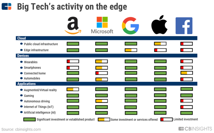 算力边缘化,催生了很多商业机会。 边缘计算是分布式计算架构,通过处理物理意义上更接近设备的数据,减少传输时间来提高运算速度,用来补充当前的云计算模型。在5G的推动下,边缘计算有助于实现带宽密集型应用,例如自动驾驶汽车和VR/ AR。根据 CB Insights 数据,边缘计算市场价值预计超过 5000 亿美元。 为了在边缘计算市场中分一杯羹,美国五大科技巨头 Facebook、Amazon、Microsoft、Google 和 Apple(以下简称为 FAMGA)正在投资边缘计算,包括云计算基础设施、设备和应用等。 FAMGA 各自的核心盈利能力各不相同,并且业务范围广泛,因此其在边缘计算侧布局的策略是独一无二的。利用 CB Insights 数据,我们分析了他们的合作伙伴、收购和投资动作,以了解每个公司在边缘计算领域的计划和打法。