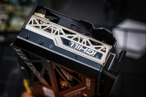 映众 GeForce RTX 3060 Ti冰龙超级版显卡采用金属枪灰色和黑色的碰撞拼接设计,这也是RTX 30冰龙家族式设计语言。映众GeForce RTX 3060 Ti显卡采用了三风扇的散热设计,没有在顶部额外搭载风扇。