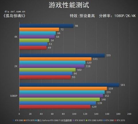 《孤岛惊魂5》同样算是优化比较到位的3A大作,映众RTX 3060 Ti 冰龙超级版显卡比RTX 2080在1080P分辨率下分数高2%;2K分辨率下高14%;4K分辨率下高18%。