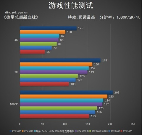 《德军总部新血脉》由于自带两个benchmark,所以我们的数据取跑分均值。映众RTX 3060 Ti 冰龙超级版显卡相较RTX 2080 SUPER在1080P分辨率下提升7%,2K分辨率下提升16%,4K分辨率下提升4%。但从如此规整的等差数列中,不难发现RTX 3080原本不应该是这个水平,其中不知道是驱动问题还是游戏更新所致。