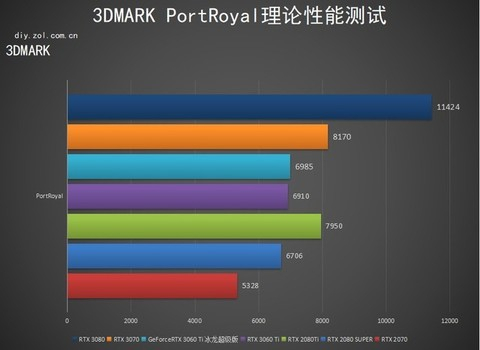 PortRoyal是3DMARK中专门针对光追性能的测试项,映众GeForce RTX 3060 Ti冰龙超级版的测试结果要优于RTX 2080 SUPER,幅度为4%左右。