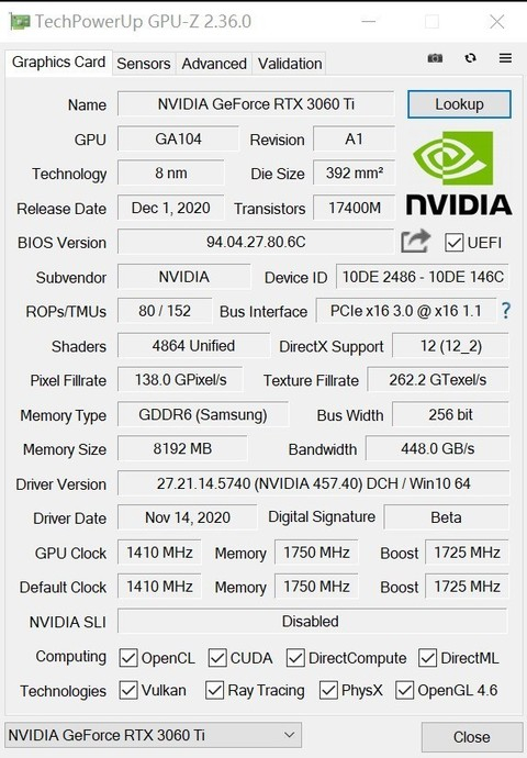 首先看一下GPU-Z的参数,软件更新到2.36已经可以正确显示核心并修复了纹理单元识别错误的情况。RTX 3060 Ti采用GA104核心,三星8nm工艺,芯片面积392平方毫米,拥有4864个CUDA,映众GeForce RTX 3060 Ti冰龙超级版的频率为1410-1750MHz。频率相较于公版要更高一些,显卡采用8GB GDDR6显存,位宽为256bit,显存带宽达到了448GB/s,光栅单元和纹理单元为80和152。