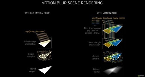 第二代RT Core可以让光线追踪与着色同时进行,进行的光线追踪越多,加速就越快,它将光线相交的处理性能提升了一倍,在渲染有动态模糊的影像时,按照NVIDIA自己的实测,比Turing快8倍。