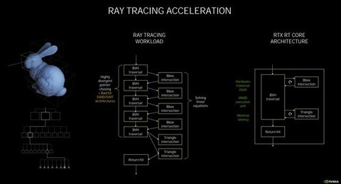 在此次的NVIDIAAmpere架构中,NVIDIA官方宣布为第二代RT Core,它和第一代有什么不同呢。首先要知道RT Core的工作原理是,着色器发出光线追踪的请求,交给RT Core来处理,它将进行两种测试,分别为边界交叉测试(Box Intersection testing)和三角形交叉测试(Triangle Intersectiontesting)。基于BVH算法来判断,如果是方形,那么就返回缩小范围继续测试,如果是三角形,则反馈结果进行渲染。