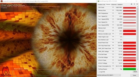 功耗测试中,我们选择FurMark软件进行拷机测试,功耗仅计算显卡自身。作为一款甜品级显卡映众RTX 3060 Ti 冰龙超级版显卡的功耗要小得多,在峰值情况下整体平均在205W左右。