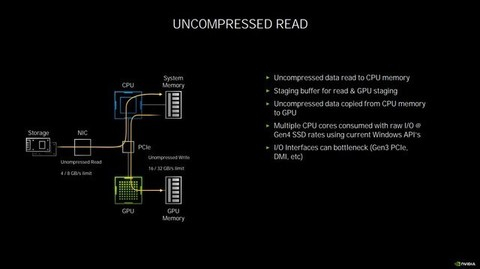 在这个过程中,会占用多个CPU核心,压力急剧增大,占用较多的内存,而此时其实GPU是处于闲置状态的。RTX IO的作用就是越过CPU解压再传输数据这一步,直接从PCIE总线读取硬盘上经过压缩的数据,并且完成无损GPU解压,降低CPU占用,变向提升了性能。