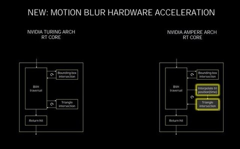 在Turing的RT Core中,可以每个周期完成5次BVH遍历、4次BVH求交以及一次三角形求交,在第二代RT Core 里,NVIDIA增加了一个新的三角形位置插值模块以及一个的额外的三角形求交模块,这样做的目的是为了提升诸如运动模糊特效时候的光线追踪性能。