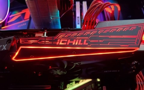 映众GeForce RTX 3060 Ti冰龙超级版显卡侧面拥有一个LED炫红灯箱,在未点亮的状态下为全黑屏,看上去比较沉稳低调。点亮显卡以后我们就能看到炫酷的灯效。不过有些可惜的是灯光只有红色,对于喜欢彩光的玩家来说有一点点可惜。