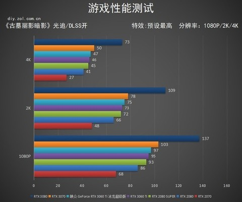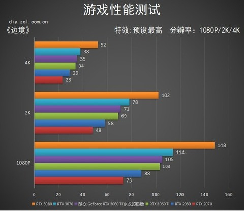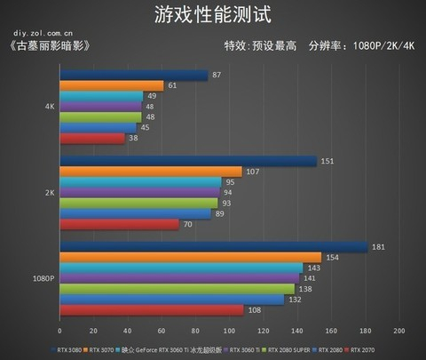 其中不难看出RTX 3080仍然遥遥领先,映众GeForce RTX 3060 Ti冰龙超级版也要小幅领先RTX 2080 SUPER的分数,差距在2帧左右。