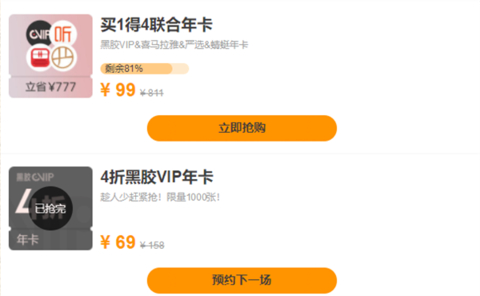 网易云音乐大促:黑胶VIP年卡仅69元 4大联合会员99元