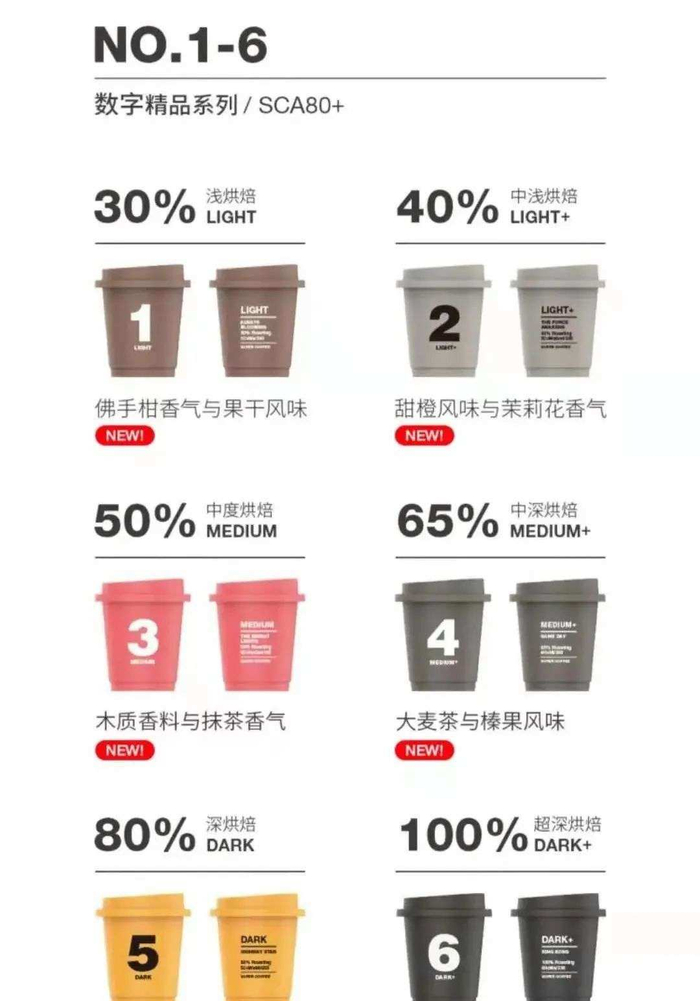 小杯子上的数字代表了不同风格的味道,数字越大,烘焙程度越深。这对咖啡小白还是挺友好的,数字简单粗暴,我不想研究你是哪国来的咖啡豆,我只在乎你苦不苦。