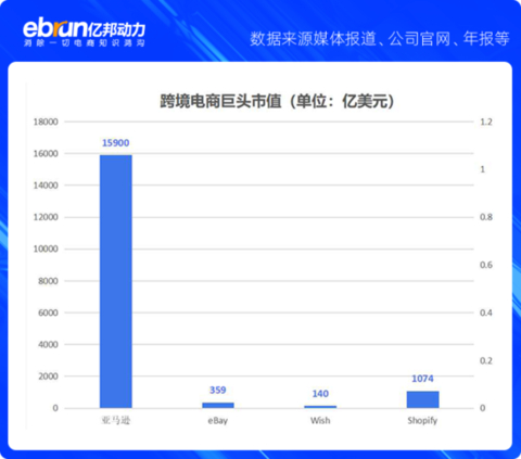 从市值上看,亚马逊市值1.59万亿美元,遥遥领先。可以令Wish望其项背的是eBay,市值359.01亿美元。目前,Wish初步估值140亿美元。