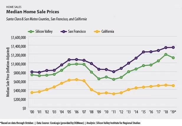 根据最新发布的硅谷指数(Silicon Valley Index),2019年,尽管硅谷地区房价下降6%,但其房价中位数仍高于100万美元,为全美最高。