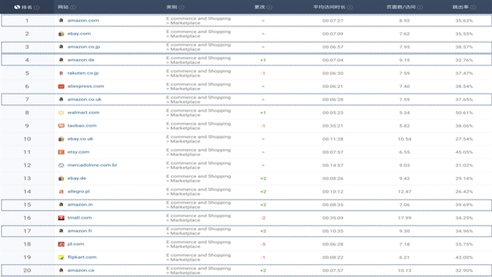 通过以上的三个平台流量和排名对比,仅仅amazon>ebay>aliexpress, 仅仅amazon美国站的流量就存在巨大的优势。我们再看看在全球电商排行榜中亚马逊其他国家站点的表现。