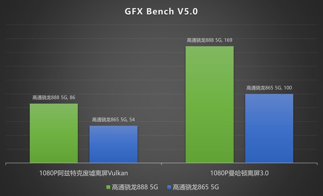 GFX Bench是一个专门测试GPU的跑分基准,对游戏性能有要求的用户可以重点注意这一项。本次高通骁龙公布的跑分包括了1080P阿兹特克废墟离屏Vulkan和1080P曼哈顿离屏3.0这两项,分别测试了骁龙888 5G在Vulkan 1.0和OpenGL ES3.0这两个图形API下的性能。