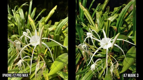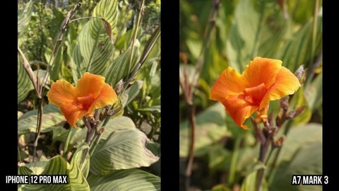 在这组照片的拍照对比中,iPhone12ProMax和索尼A7Mark3之间的拍照对比,可以看到索尼A7Mark3拍摄的照片中被拍摄的花朵背景虚化效果非常不错,而iPhone12ProMax相比而言,花朵背景虚化效果则显得一般般。从目前的整体效果上来看,显然索尼A7Mark3的拍照效果更好。