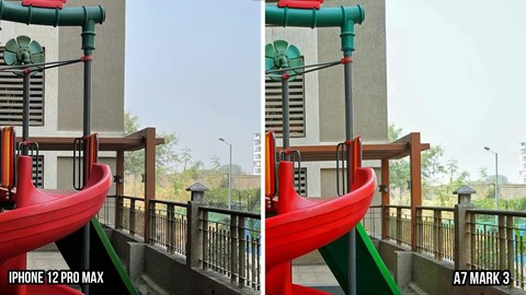 依然是室外环境中的拍照对比,但是被拍摄物体没有阳光的直射。可以看到iPhone12ProMax拍摄的滑滑梯的颜色比索尼A7Mark拍摄的滑滑梯的颜色要更深,虽然都是红色,但是iPhone12ProMax拍摄的滑滑梯颜色是深红色,而索尼A7Mark拍摄的滑滑梯的颜色是大红色。另外在滑滑梯上方的绿色管道,在颜色方面也有区别,iPhone12ProMax的更暗一些,索尼A7Mark拍摄的则更亮一些。