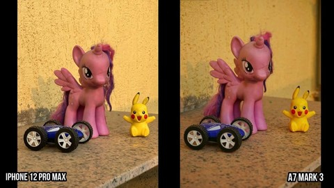 在这组依然是室外环境中的拍照对比,可以看到iPhone12ProMax和索尼A7Mark3之间的区别,主要还是集中在色彩的表现方面。iPhone12ProMax拍摄的照片整体亮度更高,同时玩偶背面的墙壁上,颜色偏黄色多一些。索尼A7Mark3拍摄的照片中,玩偶背面的墙壁上的颜色则比较暗,同时整体的亮度较低一些。