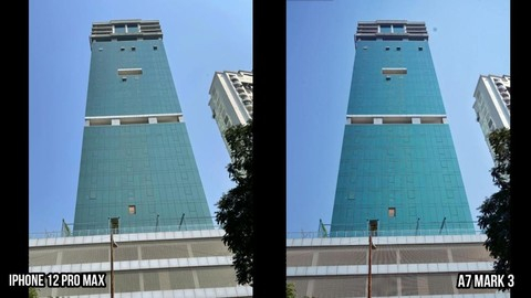 对于这组建筑物作为被拍摄主体的照片中,iPhone12ProMax拍摄的照片中的建筑物的外表面,在颜色方面则稍微有些淡,虽然还是绿色。索尼A7Mark拍摄的照片中,建筑物表面的颜色是偏蓝色多一些,整体上而言索尼A7Mark3拍摄的建筑物的外表面颜色比iPhone12ProMax要更深一些。