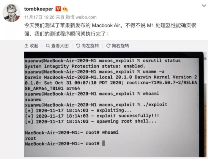 搞笑的是,玄武实验室负责人于旸事后发微表扬了M1芯片。