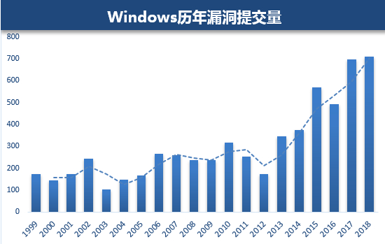 然而微软反其道而行,漏洞不仅没有变少,反而越来越多,18年达到700个,是1999年的4倍。