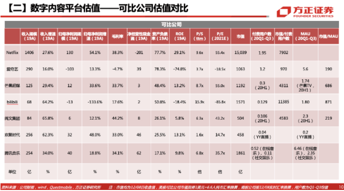 腾讯数字内容平台收入包括腾讯视频、腾讯动漫、腾讯新闻、QQ音乐等内容服务会员收入+媒体广告收入,公司财报公布20Q3收费增值服务注册账户数达2.13亿人,我们估算2020年收费增值服务注册账户2.2亿人,2020年合计去重MAU7.2亿,对此采用单用户估值法。