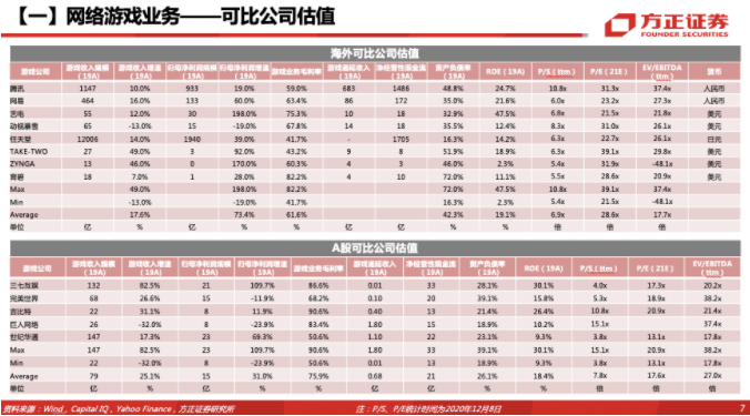 我们选取8家美股及5家A股代表性游戏公司,21年PE均值分别为28.6、17.6x。考虑到腾讯游戏的龙头地位,且后续重磅新品储备丰富(包括《使命召唤手游》、《DNF》、《英雄联盟手游》等),我们给予其35倍PE,对应21年目标市值约为1.93万亿元人民币,22年目标市值约为22043亿元。