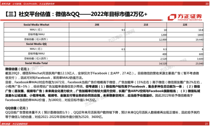 因此2022年给予微信略高于Facebook当前的单MAU价值,为1800元,对应目标市值1.94万亿。