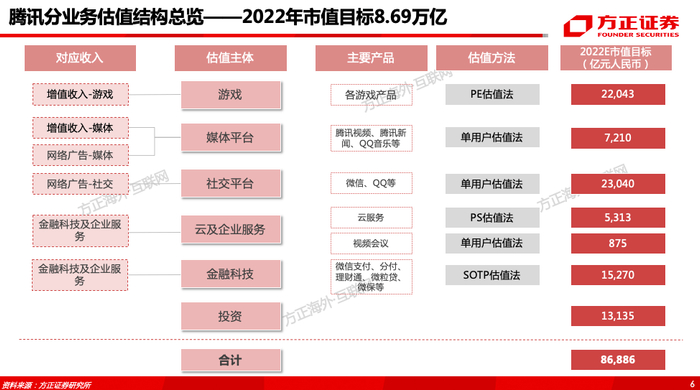 SOTP估值:分别给予2022年腾讯游戏业务、数字内容平台、社交平台、金融科技业务、云及企业服务、投资公司等六大板块目标市值22043、7210、23040、15270、6063、13135亿元,合计目标市值86885亿元。