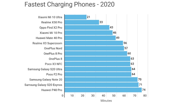 近日,俄罗斯媒体AndroidAuthority对2020年部分热门快充手机,进行充电测试,并做出排名。
