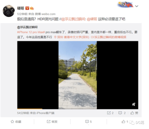 有微博大V发布视频称,iPhone 12 Pro Max录像时频闪严重,室内室外都一样,重启后也不行。